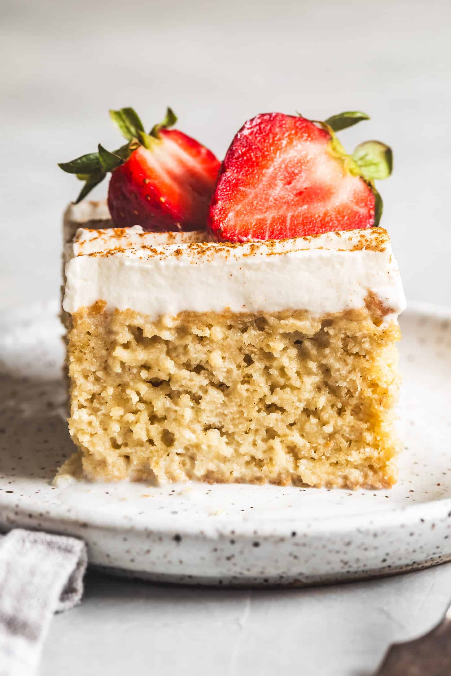 This gluten-free tres leches cake is rich, ultra-moist, and tender, with a light sponge that soaks up every drop of the sweet three-milk mixture. The crumb stays soft and airy without ever turning soggy, thanks to a perfectly balanced soak that gives you all the creaminess without the mush. Topped with whipped cream and a dusting of cinnamon, it's the kind of dessert that steals the show.